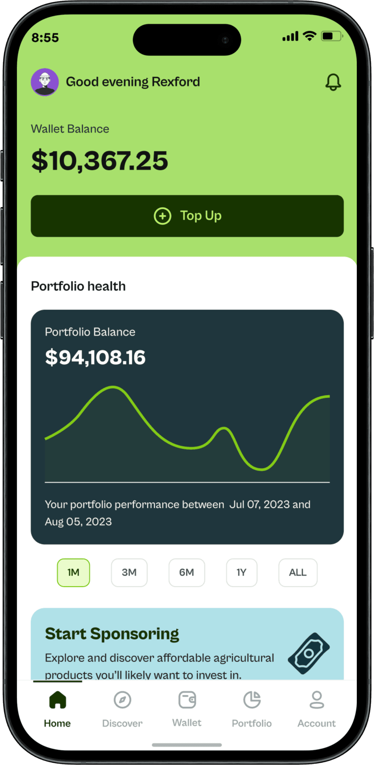 View your farmriz balance, portfolio health, and investing action, all from one place